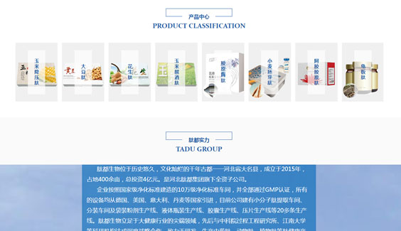河北肽都生物科技有限公司位于歷史悠久,文化燦爛的干年古都一一河北省大名縣,成立于2015年,占地400余畝,總投資4億元。是河北肽都集團旗下全資子公司。企業(yè)按照國家級凈化標準建造的10萬級凈化標準車間,并全部通過GMP認證,所有的設備均從德國、美國、意大利、丹麥等國家引進,目前公司建有小分子肽提取車間、分裝車間及袋裝粉劑生產(chǎn)線、液體瓶裝生產(chǎn)線、膠囊生產(chǎn)線、壓片生產(chǎn)線等20多條生產(chǎn)線。肽都生物立足于大健康行業(yè)的尖端領域,先后與中科院過程工程研究所、江南大學等科研機構達成深度戰(zhàn)略合作。致力于研發(fā)、生產(chǎn)中藥肽、動物肽、植物肽等小分子活性肽產(chǎn)品。