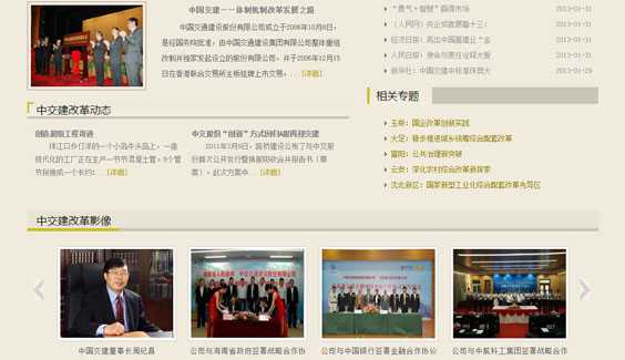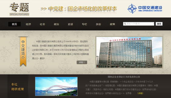 負(fù)責(zé)中國(guó)交建專(zhuān)題頁(yè)面的設(shè)計(jì)制作,該頁(yè)面以黑色為主色調(diào),加以棕、黃為點(diǎn)綴加以突出,符合企業(yè)特點(diǎn),體現(xiàn)企業(yè)沉穩(wěn)、安全、實(shí)力雄厚。整個(gè)設(shè)計(jì),簡(jiǎn)潔,大方,彰顯企業(yè)實(shí)力。
