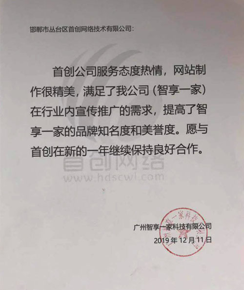 首創(chuàng)公司服務(wù)態(tài)度熱情,網(wǎng)站制作很精美,滿足了我公司(智享一家)在行業(yè)內(nèi)宣傳推廣的需求,提高了智享一家的品牌知名度和美譽(yù)度。