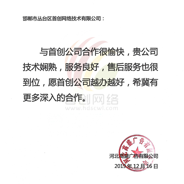 與首創(chuàng)公司合作很愉快,貴公司技術(shù)嫻熟,服務良好,售后服務也很到位,愿首創(chuàng)公司越辦越好,希冀有更多深入的合作。