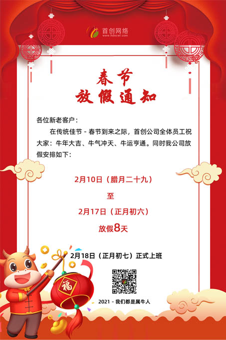 鼠去牛來辭舊歲,燕舞鶯歌處處春,在傳統(tǒng)佳節(jié)-春節(jié)到來之際,首創(chuàng)公司全體員工祝新老客戶:牛年大吉、牛氣沖天、牛運(yùn)亨通。同時(shí)綜合我公司實(shí)際情況,現(xiàn)放假安排如下: 一、放假時(shí)間 公司定于2021年2月10日至2月17日,共8天。2月18日(正月初七)正···